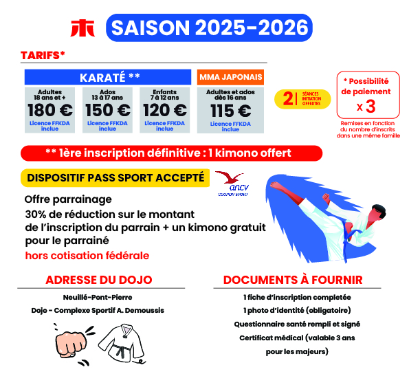 Née en 2016 en Touraine, notre club est dédié au Karaté Shotokan et au Kudo (MMA Japonais). Que vous soyez un adulte cherchant à améliorer votre condition physique, un adolescent en quête de discipline et de confiance en soi, ou un enfant désireux d’apprendre les bases du Karaté, notre club est l’endroit idéal pour vous.